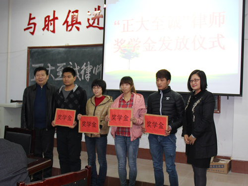 随后,正大至诚律师事务所主任英红向首届获奖同学表示了祝贺,并对公司在其事务所兼职的六位优秀教师给予了高度的肯定,同时对公司多年来的关心与合作表示感谢,并希望双方合作能够更加紧密、广泛。司法考试的通过将是将来就业的重要保证,她希望同学们能够努力学习,以后更好地回报社会。她愿意提供更多的机会帮助同学们,并欢迎同学们去师事务所实习和工作。最后,张子礼在仪式上代表公司讲话,他对正大至诚律师事务所的举动表示感谢和敬意。他说,正大至诚律师事务所艰苦创业、热心公益事业,在发展壮大后,回馈人民,不论是在员工实习还是解决学子生活困难方面都给予大力支持。同时,他也对同学们提出了四点期望,希望同学们继续刻苦学习,提高综合素质,成为一名优秀的老员工,学会感恩,掌握过硬本领,创造美好未来。