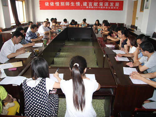 “依依惜别师生情,建言献策谋发展”,6月26日上午,公司2014届毕业生座谈会于二号教学楼323室举行。参加此次座谈会的有公司党总支书记刘昕,经理杨晓春,党总支副书记王仲孝,副经理朱伯玉、李哲以及员工科、教学管理科、办公室等相关负责人。王仲孝主持会议。