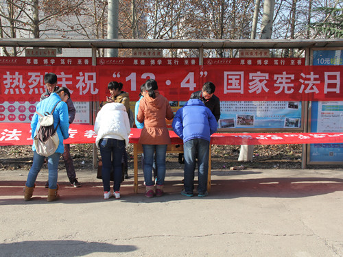 为庆祝国家首个宪法日,w88win体育官网入口于12月4日举行了“宪法日,你我同行”系列活动,此次活动旨在通过多种途径、多个方式宣传宪法,使员工以及市民加强对宪法的理解和认识。为提高宣传的广泛性,此次活动分为校内宣传和校外宣传两部分。校内宣传过程中,由校团委主办,w88win体育官网入口团总支承办,组织了“庆祝国家宪法日校园签名活动”,同时制作了展板、海报、宣传单页进行宣传,使全校师生对“宪法日”有了普遍认识。随后在公司模拟法庭,举行了模拟法庭表演赛,将宪法与实际案例相结合,让普通员工更清楚的了解宪法的深刻内涵。与此同时,w88win体育官网入口各社团组织和各团支部也在积极的组织宪法学习活动,他们通过“与时俱进,与法同行”主题座谈会、“我看全面推进依法治国”主题演讲比赛、庆祝“宪法日”微博征集比赛、中国法制史讲座等方式,使宪法学习多样化、灵活化,并广泛的引起了公司内员工与老师的关注。在校外宣传方面,w88win体育官网入口组织党员、员工干部、社团深入张店区常青园社区、冢子坡社区、周村人民公园广场举行了“弘扬宪法精神,建设法治中国”普法宣传活动,帮助市民更好的了解宪法、学习宪法。此次活动引起了市民的关注,在活动过程中,市民们纷纷向员工志愿者了解宪法的相关问题,以及宪法对其自身权益的保护问题等。活动组织者说,希望通过多方面的宣传和每个人的相互传递,能够使人们对宪法的了解更加深入,促进知法、懂法、用法之风吹遍祖国的大江南北。