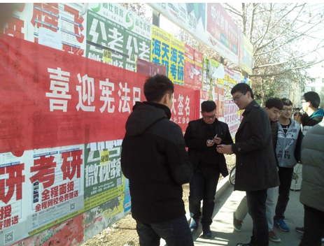中国一向注意依法治国,作为新一代的我们更不能疏忽宪法的文化建设。上午10:00活动正式开始。协会成员将写有“喜迎宪法日,万人大签名”长5米、宽1米得横幅在二餐门口铺展开来,并引领同学们前来签名。在横幅旁边有许多协会成员在为同学们发放宣传单页进行宣传讲解,获得了大家的认可和好评。随着用餐时间的到来,二餐门口的人也越来越多,而前来展台进行签名的同学也是络绎不绝。12:45横幅上已经签满了名字,协会成员随后拍照留念。13:00活动圆满结束。