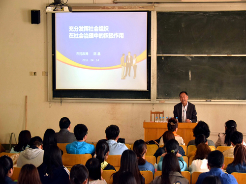 报告会上,陈晶结合个人成长经历及经验,为同学们介绍当今社会求职需注意的问题。他以公务员求职为例,为同学们讲述简历制作的注意事项。此外,他也从一些员工关注的问题入手,深入浅出地教导同学们要敢于面对挫折,在生活中要树立信心、做好准备、保持激情。陈晶围绕着“社会组织、社会组织作用、存在问题、思考及建议”四方面展开报告。他说,十八大以来,政府越来越重视社会组织发展,未来社会组织发展任重道远,要坚持健全完善法律制度和体系、强化监管和服务,才能够使社会组织健康快速发展。