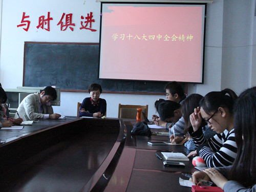 活动伊始,许燕飞就全会内容向与会员工提出要求,她说老员工应从以下三个方面提高自己。第一,提高自身思想政治素质,自觉加强社会主义核心价值观教育活动,提高政治素质,自觉树立法制观念。第二,提高自身专业素质,主动,扎实,宽泛得学习,做到学习正规化、专业化、职业化。第三,做青年普法志愿者,要求员工从课堂走出去,用实际行动,通过各种方式向社会群众普法。随后侯振中向大家解读了十八届四中全会公报的重要内容。他表示,此次四中全会将着力点放在法制建设上面,提出全会主要内容是全面推进依法治国,总目标是建设中国特色社会主义法治体系,建设社会主义法治国家。侯振中着重介绍了建立从符合条件的律师、法学专家中招录立法工作者、法官、检察官这一制度,并对w88win体育官网入口法学专业的同学提出要求,希望他们能够学好法律知识,为依法治国助力。