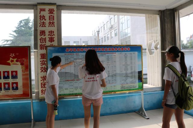上午九点,由八名实践队员组成的参观小分队走进沂源县环保局了解当地环境现状与环保政策,由环保局负责人接待了大家。首先,环保局负责人带队员们参观环保局,了解县环保局排污收费及环境监测排污收费标准、了解沂源县环保“四德工程”。接下来,由环保局局长对沂源县环保局局长展玉碌同志就此次社会实践与队员们进行了指导交流。他说,“欢迎大家来到沂源进行社会实践,此次社会实践为同学们提供了一次锻炼自己、提高自己的机会”,希望大家在实践中能够有所收获。”最后,队员们就自己感兴趣的环保问题、在调研中不懂的难题与环保局的工作人员进行了交流,工作人员就队员们提出的问题积极地进行了解答。