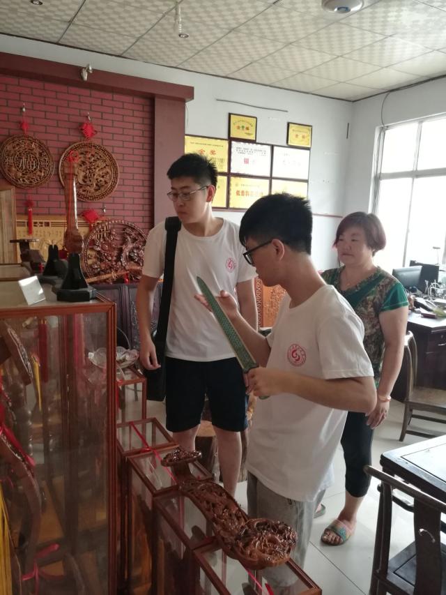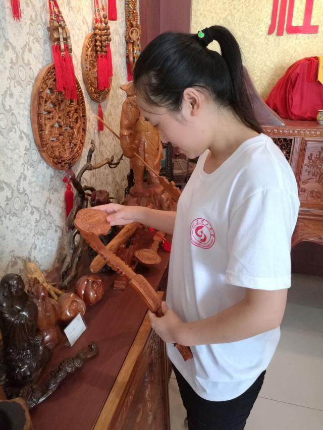 今天我们“沂源情”团队一早就出发来到了当地赫赫有名的企业——杜氏木艺坊。杜氏木艺坊位于西里镇的江家峪村,属于镇上果木深加工的典型代表,其利用丰富优质的桃木、苹果木资源,深挖桃木“吉祥、辟邪、纳福、镇宅”之文化寓意,开发研制以牛郎织女爱情文化为主题的工艺品和日用品。杜氏木艺坊领导人热情接待了我们,我们跟随她参观了各种加工制作完成的工艺品。若不是亲眼所见,真的很难想象各种废弃的“枯枝烂木”可以变得如此精致完美。该企业将老化的桃木加工成各种挂件、工艺品、家庭装饰件、桃木宝剑、如意、佛珠手串、梳子、看盘等等。展示厅内玲琅满目,团队成员们在经过同意后对各种工艺品进行了视觉、听觉、触觉全方位的感受,其产品特色鲜明,工艺独到,设计精湛,制作考究,具有极高的欣赏、实用和收藏价值。