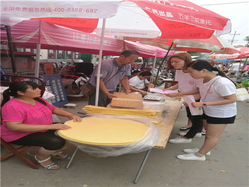 继续在集市上进行问卷调查。实践团成员来到食品区,正好遇到一个年轻人在卖自己家制作的绿豆饼,通过交流得知摊主是湖北某大学的一名大三员工,开学即将大四,自己利用假期时间帮助父母卖点东西补贴家用,这种精神领实践团成员甚是佩服。