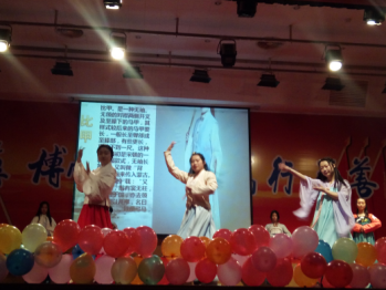 首先展开的是一场张婷婷老师指导编排的汉服走秀,身着不同形制的汉服社成员们随着音乐陆续走上舞台。一些女生身着齐胸襦裙,轻灵飘逸又不失俏皮可爱,有些女生身穿袄裙,更为沉稳。而最为华美庄重的,莫过于曲裾,能更好的展现出女子的柔美大方。同样,有男生身着男款汉服,英姿飒爽。在走秀之后,几名女生跳起了《兰陵王入阵曲》这支舞蹈。旋转与动作之间,更好地向大家展示了汉服之美。