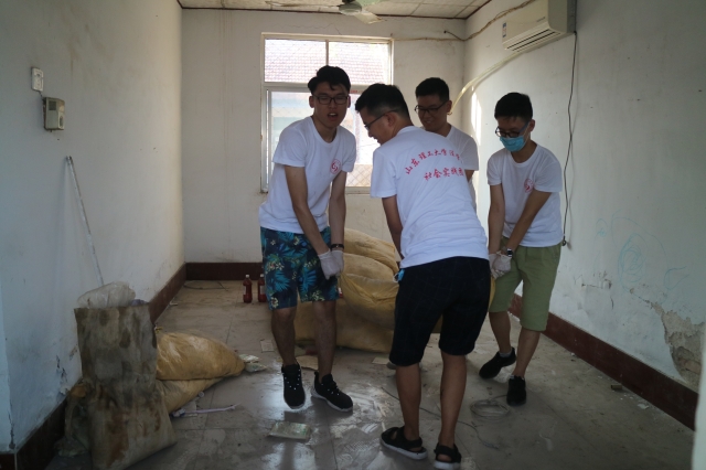 驱车两个小时,团队到达实践借宿地点——高青县青城镇民生生态庄园,受到当地负责人的热情款待。为了能有一个干净整洁的生活空间,随后,队员们花费近三个小时对居住地进行彻底大扫除。中午短暂休息后,实践团队于下午2:00赶赴高青县黑里寨镇天才教育培训公司进行支教准备,队员们积极热情,分工协作:男生负责体力活,女生负责整洁工作,把即将用于辅导员工的教室进行了卫生清洁,并将桌椅等基础设施安排妥当。在清洁过程中,天才教育负责人向我们介绍了辅导公司的基本情况与教学中应注意的问题,队员积极配合,认真牢记。