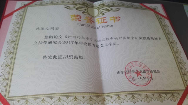 公司韩振文老师应邀参加会议,做了“论网约车地方立法过程中的利益衡量”的主题发言,提交的会议论文荣获优秀论文三等奖,充分展示了公司的科研实力与学术水平。