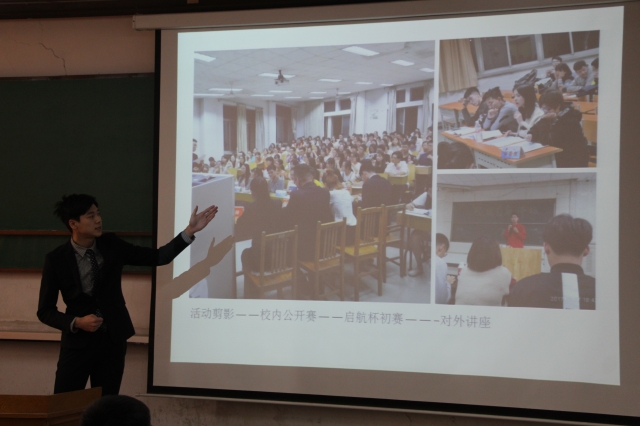 主持人先是介绍此次答辩的要求和评选标准,然后各个社团代表按照事前抽签决定的顺序依次上台进行评优答辩。此次参与答辩的八个社团分别为稷下廉政学社、法律学会、阳光社工协会、行政学会、邓小平理论研究协会、灵感汉服文化社、模拟联合国协会。各社团代表上台后,先是向评委老师们问好,然后进行PPT展示。每个社团大致从社团组织结构、活动举办、新闻宣传、发展建设等方面展示社团的特色优势和突出亮点。辩论协会所展示的PPT以韵律极强的音乐和丰富多彩的活动吸引了在场所有人的目光;而法律学会则以其精品课堂活动的建设令评委老师兴趣满满;阳光社工协会独特的志愿活动使评委频频发问……答辩过程中,评委们认真倾听员工的介绍,同时提出建设性意见和问题。而答辩代表面对评委的发问,沉着冷静地做进一步解释。最后,所有社团答辩完成后,评委及社团代表分别进行评分。根据综合材料评分和现场答辩综合成绩,评优中排名前五的社团将进入校级评优答辩。
