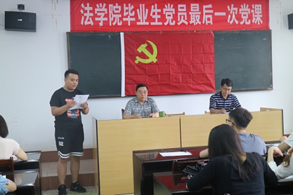 宋立平在主持党课时指出,全体毕业生党员要进一步坚定理想信念,增强党员意识,加强党性修养,把纪律挺在前面,把责任扛在肩上,把学习落到实处,真正做到思想上坚定追随,政治上绝对忠诚。在今后的工作、学习中,不忘初心,立大志向,树大目标,做大学问,成大事业,在民族复兴的伟大事业中,实现自己的人生价值和美好追求。