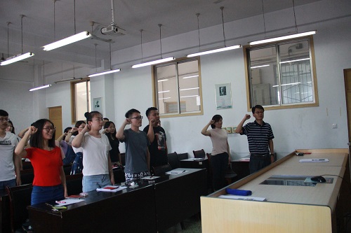 党课在庄严的国歌声中召开。党总支副书记宋立平带领毕业生党员进行党徽佩戴仪式并庄严宣誓,重温了入党誓词。
