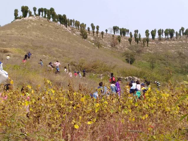 活动伊始,社团成员们陪当地孩子们一起爬山,山路长达三四里,社团成员和当地孩子们相互鼓励,顺利完成了爬山活动。在这个过程中,双方一起欣赏秋天的景色,摘酸枣、逮蚂蚱,一路上欢声笑语,其乐融融。