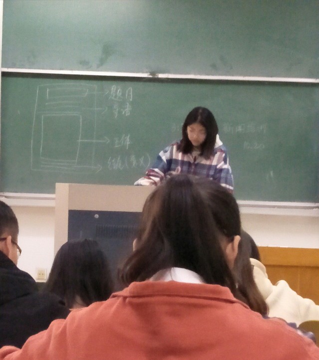 此次培训主要讲解写新闻和摄影两大部分。在讲第一部分时,学姐首先从构成新闻的六要素开始讲起,然后以示意图的形式在黑板上画了新闻的主要组成部分,仔细讲解“标题”、“导语”等各个部分的特点、写作技巧及注意事项,参加培训的同学也都认真听讲,不时地做笔记。