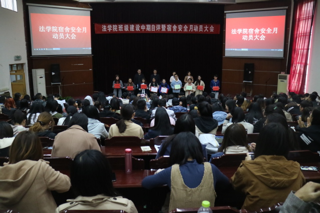 在之后的班级建设中期自评暨宿舍安全月动员大会上,由辅导员孟晶晶宣读宿舍运动会上获奖的宿舍,获奖宿舍舍长上台并合影留念。
