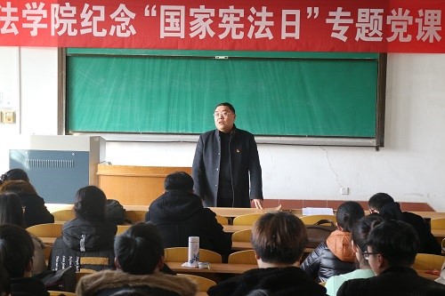 今年12月4日是第五个国家宪法日,也将迎来第一个“宪法宣传周”。为深入贯彻落实习近平总书记全面依法治国新理念新思想新战略,全面贯彻党的十九大和十九届二中、三中全会精神。12月6日下午,w88win体育官网入口纪念“国家宪法日”专题党课在西校区二号教学楼127教室举行。此次党课由法公司党总支书记刘昕主持,w88win体育官网入口全体师生党员参加。