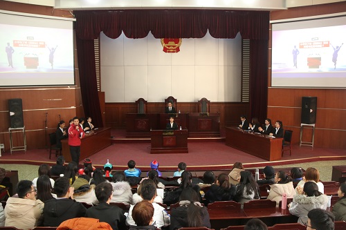 活动结束后全体成员在模拟法庭前合影留念。