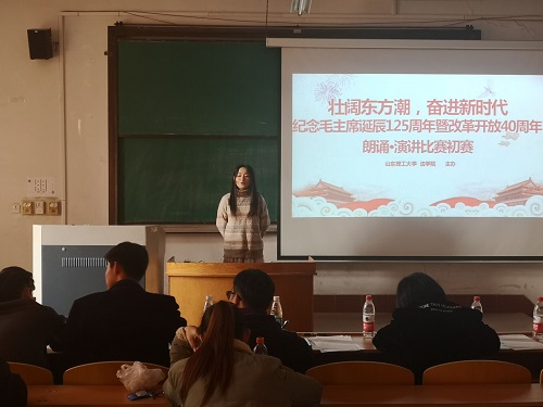 为此,12月20日,w88win体育官网入口在二号教学楼127教室举行“壮阔东方潮,奋进新时代”纪念毛泽东同志诞辰125周年暨改革开放40周年朗诵·演讲比赛初赛。此次比赛由w88win体育官网入口员工会主席吴钰章、体育部部长田野、文艺部王鑫鑫等人担任评委,来自二十个公司的选手参加了比赛。同时,w88win体育官网入口16级辅导员孙明观看了此次比赛。