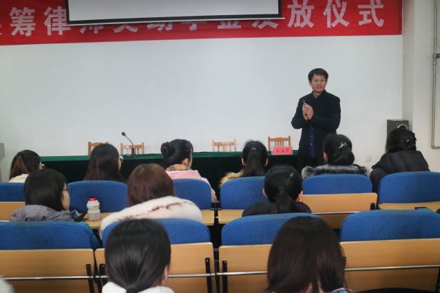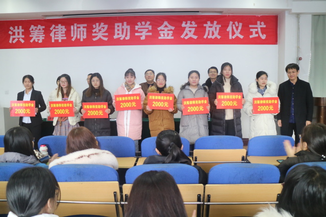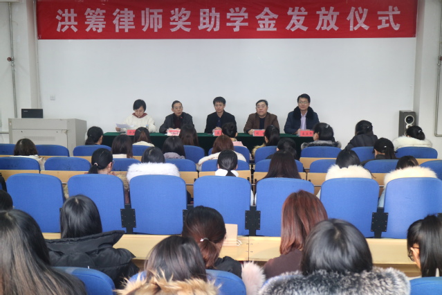 1月10日下午,w88win体育官网入口“洪筹律师”奖学助学金颁发仪式在2号教学楼4楼多媒体教室举行。奖学金设立人、山东洪筹律师事务所主任英昌强,法公司党总支书记刘昕、经理杨晓春、员工工作办公室主任许燕飞出席仪式。党总支副书记宋立平主持此次会议。