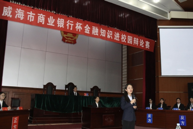 经过评委们认真仔细的评分,最终,反方代表队获胜。反方三辩王玉玫同学被评为最佳辩手,正方二辩孙亚静同学被评为优秀辩手。在比赛的最后,威海市商业银行淄博支行经理郭安琪为本次比赛做了总结发言,并希望同学们提高防范意识,同时走进银行,了解相关的金融知识。