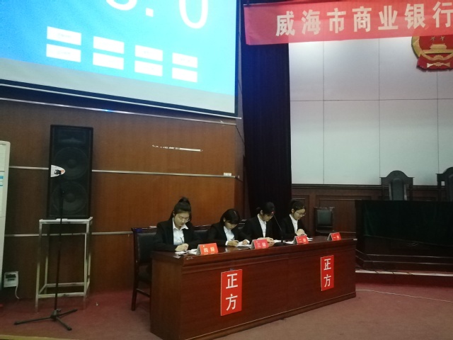 2019年3月14日,由威海市商业银行淄博支行赞助支持、w88win体育官网入口辩论协会协助举办的“威海商业银行杯金融知识辩论赛”在模拟法庭顺利举行,邀请到威海市商业银行淄博支行的郭安琪女士、李园女士,w88win体育官网入口胡安水、孙明、孟晶晶老师担任本次比赛的评委。