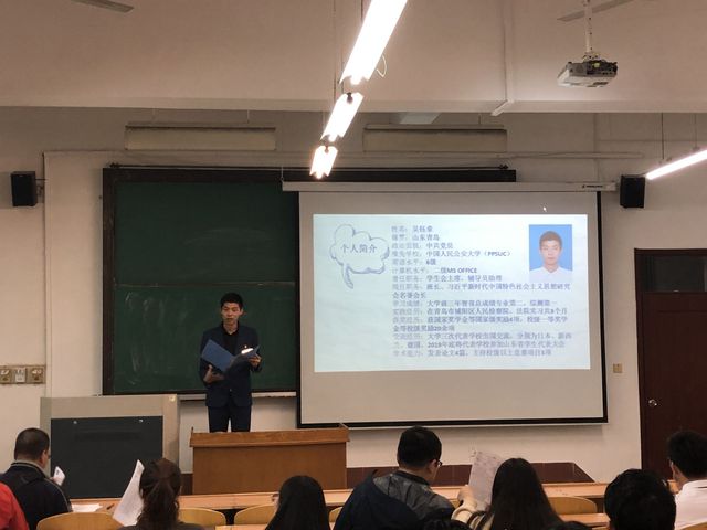 首先,17级辅导员孟晶晶就国家奖学金及省政府奖学金的评选条件、评审方法和评审程序进行介绍。随后,进行竞选者答辩环节。进入初选的20名候选人通过PPT的形式向在场评委展示了他们在学业成绩、综合素质、社会实践、创新能力等方面的优异表现,分享了自己的大学成长感悟与体验。