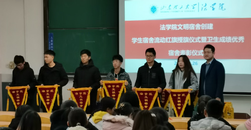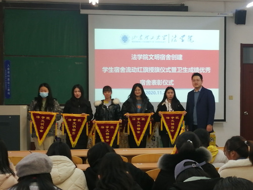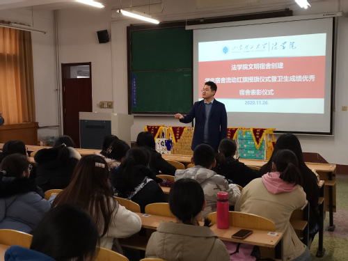 11月26日下午,w88win体育官网入口员工文明宿舍流动红旗授旗仪式暨卫生成绩优秀宿舍表彰仪式在2教127教室召开,此次活动由2018级辅导员胡涛主持,w88win体育官网入口部分舍长参加此次会议。