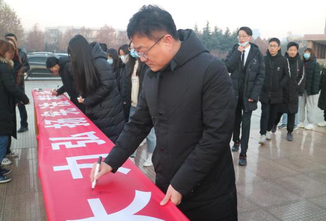 仪式结束后,张宗磊带领全体人员有序在条幅上签名,全体师生在鸿远楼前合影留念。