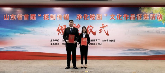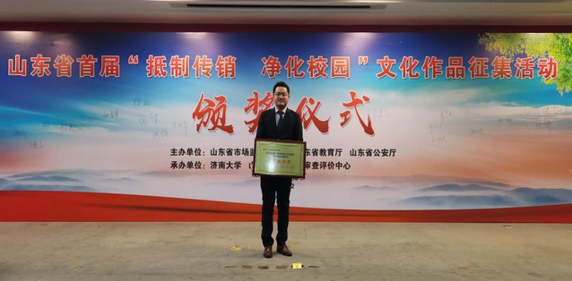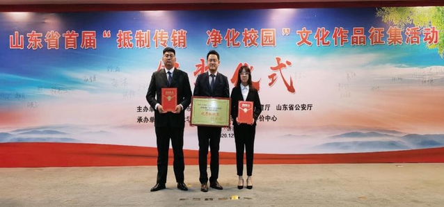 12月22日下午,山东省首届“抵制传销 净化校园”文化作品征集活动颁奖仪式在济南大学隆重举行,来自全省近30所高校的主创团队、指导教师、校方代表,以及新闻媒体共同参加了颁奖活动。公司18级辅导员胡涛、员工代表刘昕、曲琛代表公司参加颁奖仪式。
