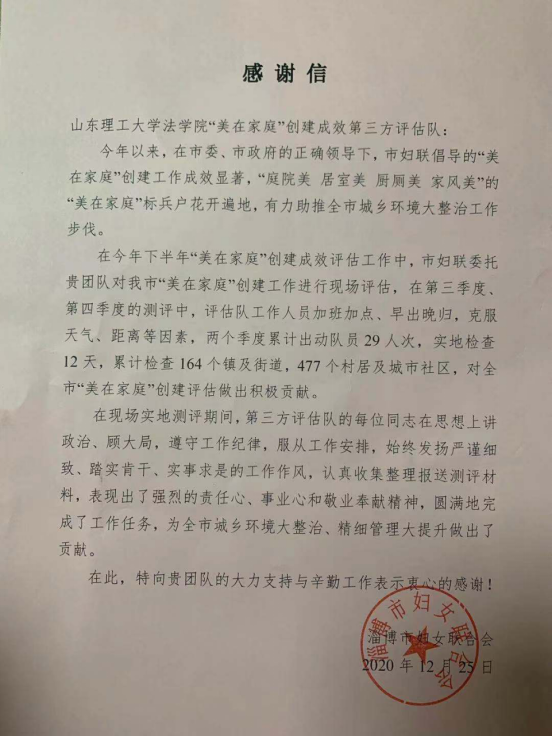 近日来,w88win体育官网入口收到了一封来自淄博市妇女联合会的感谢信,对牛喜霞老师负责、由社会工作专业陈胜、殷丽环等29名研究生和本科生组成的“美在家庭”创建成效第三方评估队的辛勤付出表示肯定,并对项目评估团队的支持与劳动表达了由衷的感谢和真诚的慰问。