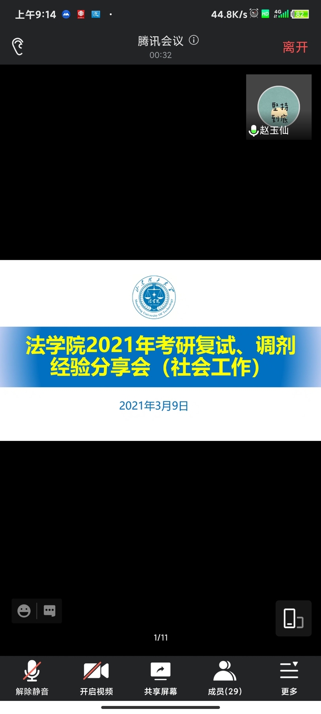 社工专业2分享会上,指导老师讲解了考研复试相关事宜,对复试的整体流程、仪态仪表进行详细解答,并提醒考生考虑疫情形势,做好线上复试与线下复试两手准备。关于调剂,老师们指出,要明确定位,了解政策,做好抉择,把握机会。