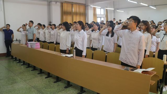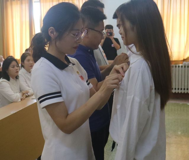 下午,员工党员在127教室观看大会重播。现场党务秘书国睿、员工第一党支部书记胡涛、第二党支部书记魏晨晨为新加入党组织的员工党员代表佩戴党徽。员工党员举行入党誓词宣誓。