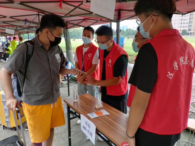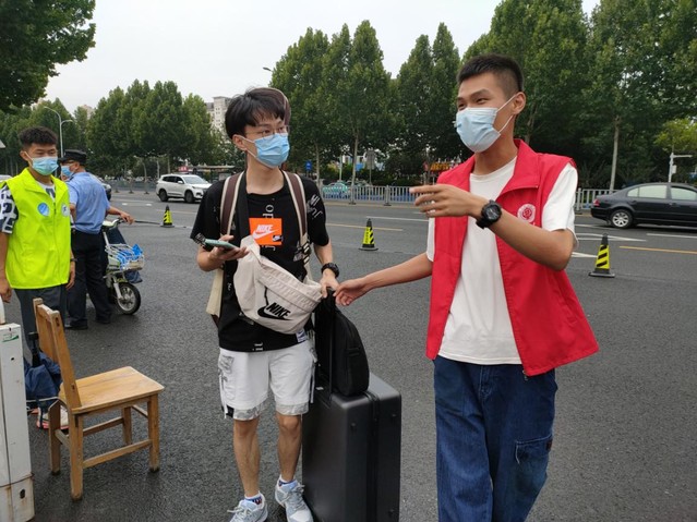 8月29日上午,志愿服务工作正式开始,省外员工返校接待工作在公司南门有序进行。志愿者们穿戴好带有w88win体育官网入口标志的红色志愿服装,在岗位上等待返校同学的到来。公司辅导员魏晨晨、胡涛在现场组织相应工作的开展,2019级以及部分2020级志愿者落实具体工作。志愿者们本着微笑服务、理解尊重、热情周到、文明礼貌的志愿服务态度,认真负责,主动帮助返校同学整理、运送行李书包,仔细检查每一位返校同学的健康码、行程码以及返校码,严格落实疫情期间的返校工作。