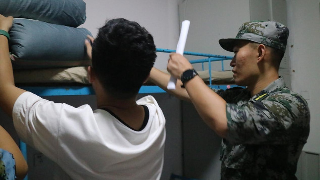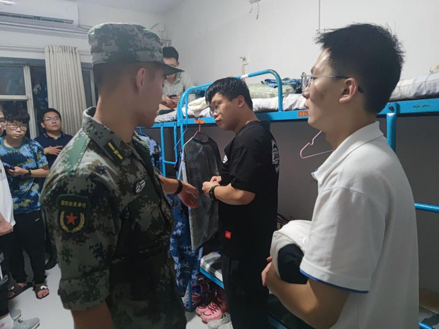 随后,教官来到在2号宿舍楼公寓,每个宿舍派出选出代表听取教官讲解内务要求,新生们仔细观察并使用手机加以录像,记录被子的叠法,同时积极与教官互动,询问内务具体细节。随后,各位代表返回宿舍将所学的要求向舍友进行讲解,确保每位新生明确内务要求。各教官走访宿舍进行现场指导,对存在的一些问题加以纠正。经过一番学习、整理,新生的宿舍焕然一新。