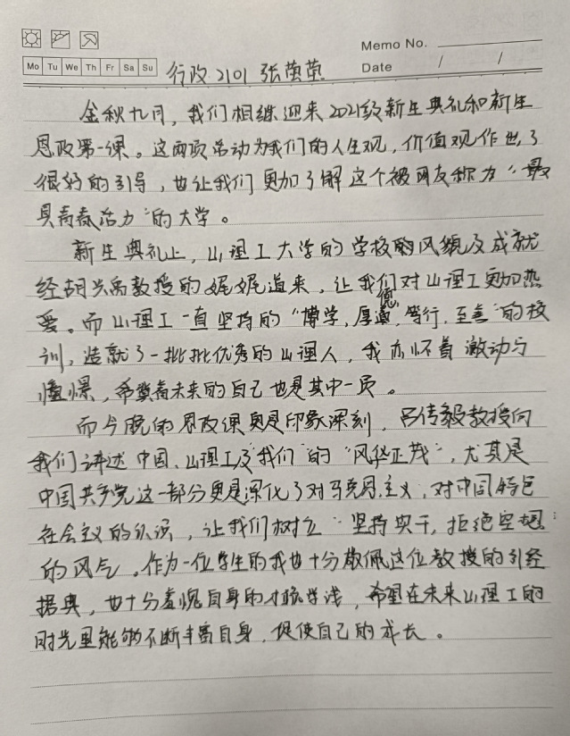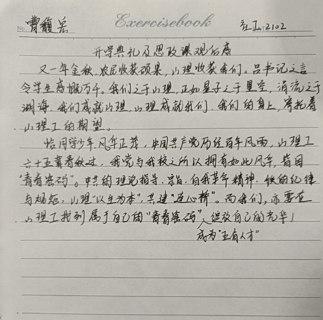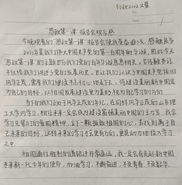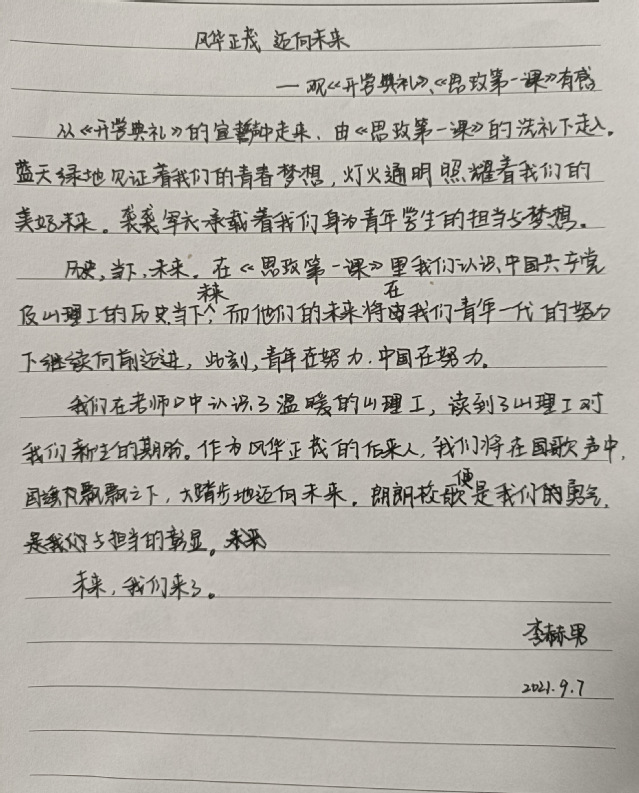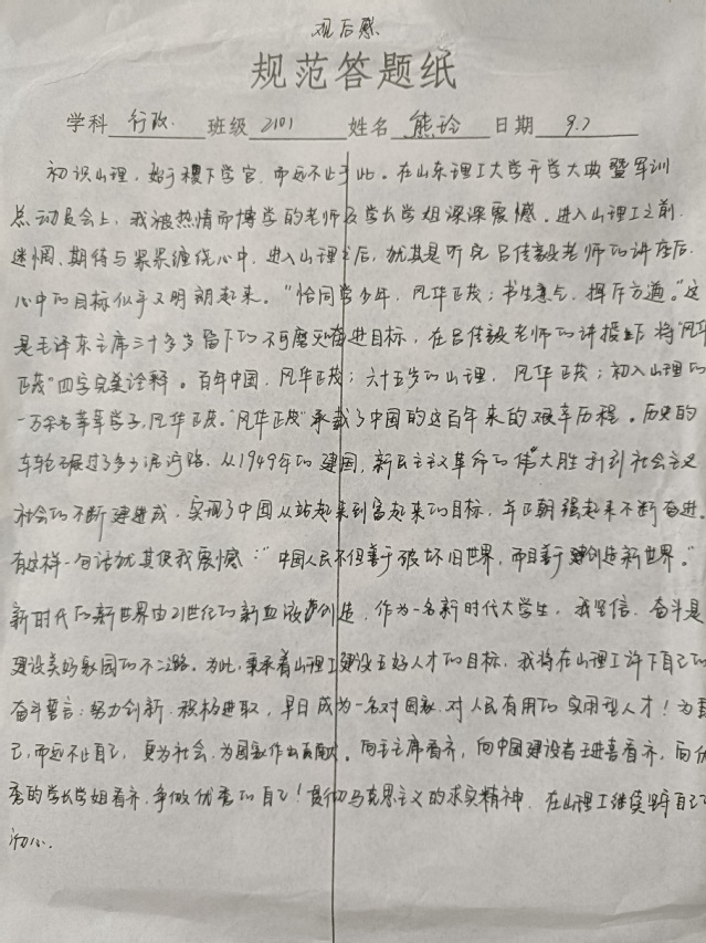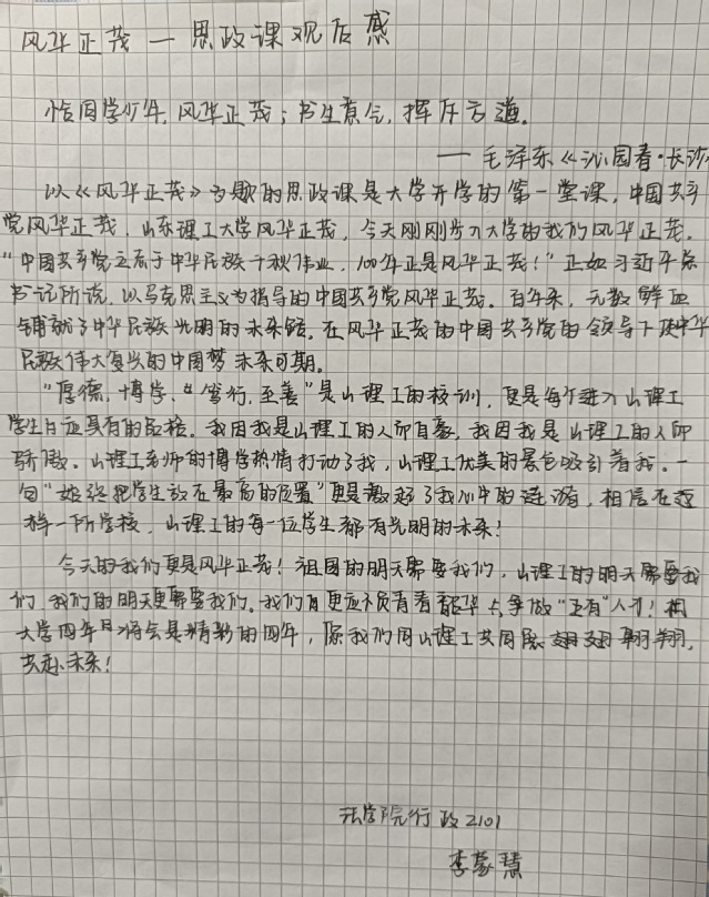 在观看直播的过程中,新生们全神贯注,认真记录重点内容,思政课后,同学们第一时间写下了自己的感悟。这是一节意义非凡的思政课,作为新时代的青年,要不忘初心,砥砺前行,以青年之态,在新天地大展身手,将青春活力化为磅礴力量以投入建设全新祖国的步伐中。