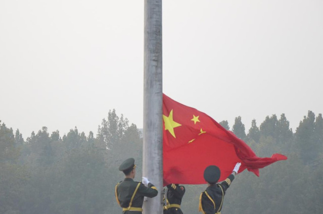 早上6时30分,国旗护卫队迈着铿锵有力的步伐护送国旗入场。伴随着庄严的《义勇军进行曲》,鲜艳的五星红旗冉冉升起,全体人员向国旗行注目礼。