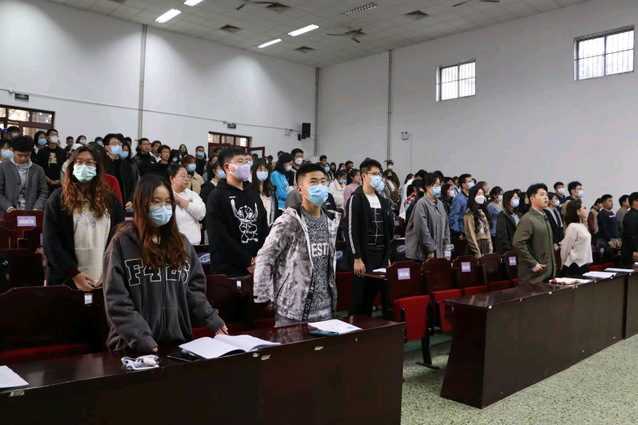 会议在庄重严肃的国歌中拉开帷幕,全体老师同学起立,奏唱国歌。