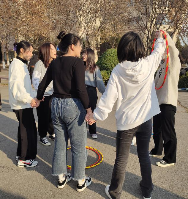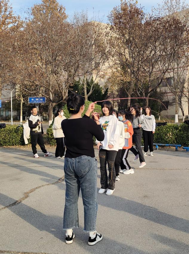活动分为四项,分别为:团体跳大绳、两人三足、穿越呼啦圈和摸石头过河。首先进行团体跳大绳项目,每小组选出两人摇绳,其余成员跳绳。同学们参与积极,配合默契,现场氛围高涨。
