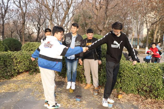 活动最后一项为摸石头过河。参赛小组位于起跑线的河石上,踩着河石从起点线到终点线。游戏过程中小组成员不得触碰河石之外的其他支撑物,各小组成员互相支撑,团结合作,共同过河。