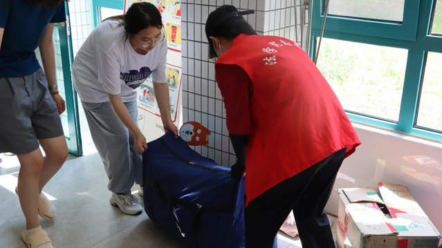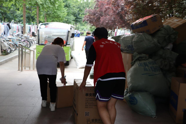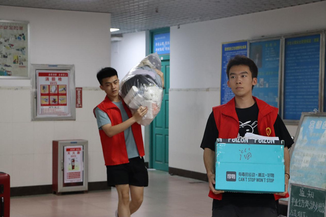 同学们不畏炎热,深入毕业生寝室,数次往返于寝室、楼下、校门和邮寄点,为需要帮助的学长学姐们搬运行李。