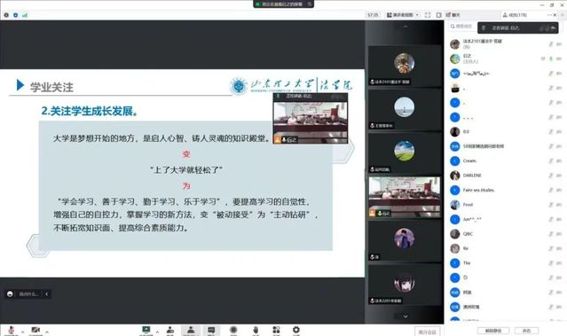 8月24日下午,w88win体育官网入口在2号教学楼323教室通过线上视频的方式召开2022级新生家长见面会。法公司党委书记张宗磊、经理王玲、党委副书记宋立平、新生辅导员李兰晶、胡涛与22级新生及家长360余人在线进行互动交流。见面会由宋立平主持。