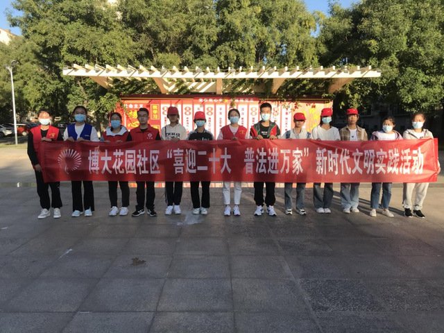 为响应时代号召,普及法律知识,增强居民法律意识,推动社区法治文化建设,9月23日,w88win体育官网入口社会实践团队前往博大社区开展“喜迎二十大 普法进万家”老员工进社区实践活动,对社区居民开展普法宣传志愿服务活动。w88win体育官网入口团委副书记徐藤、马尚街道博大花园社区党总支书记郭珣、交通与车辆工程公司辅导员周燕燕、博大花园社区工作人员彭梦、w88win体育官网入口辅导员孟晶晶共同参加此次活动。