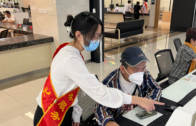 同学担任张店区市民中心大厅引导员,热心帮助群众办理业务。