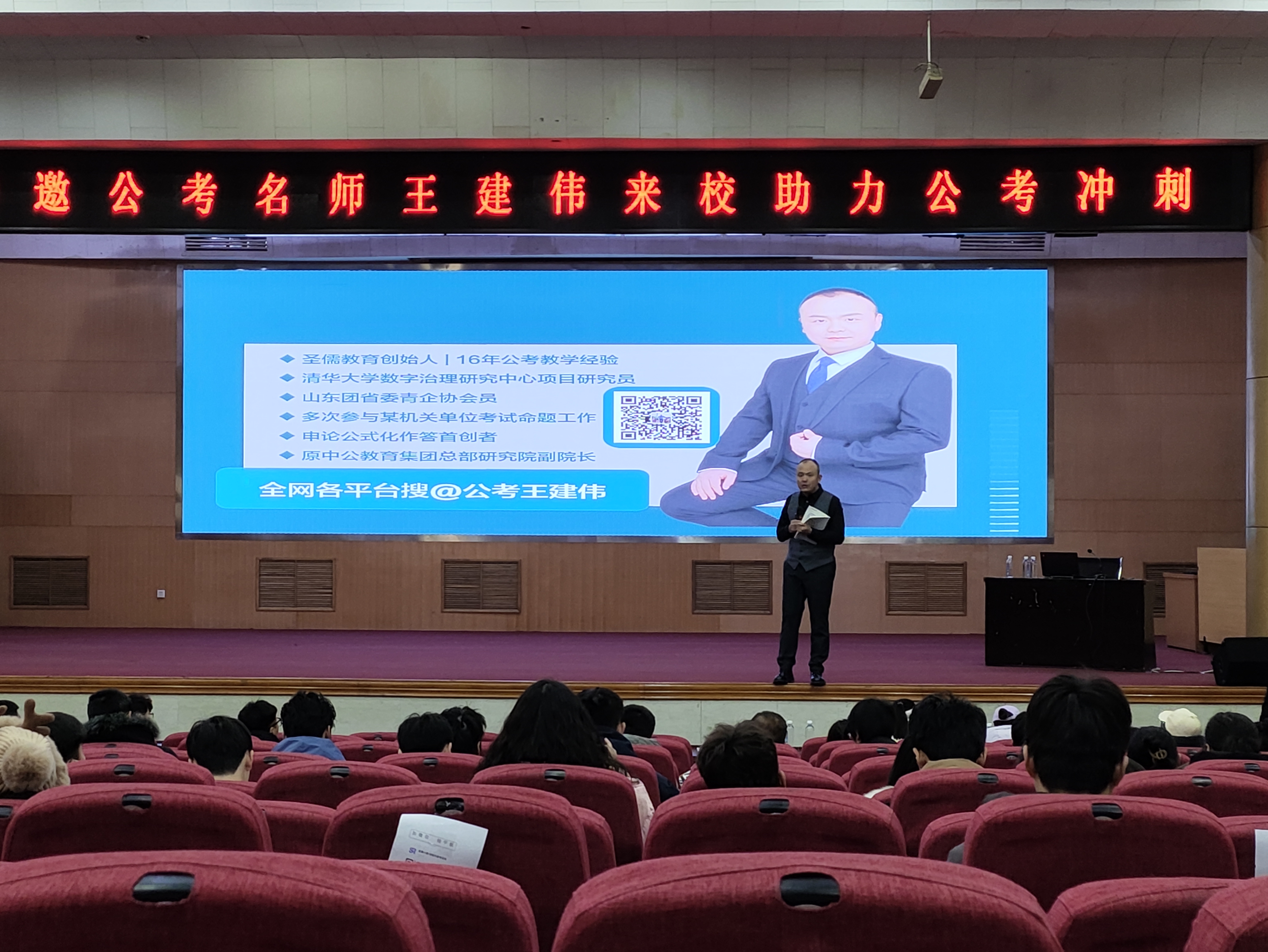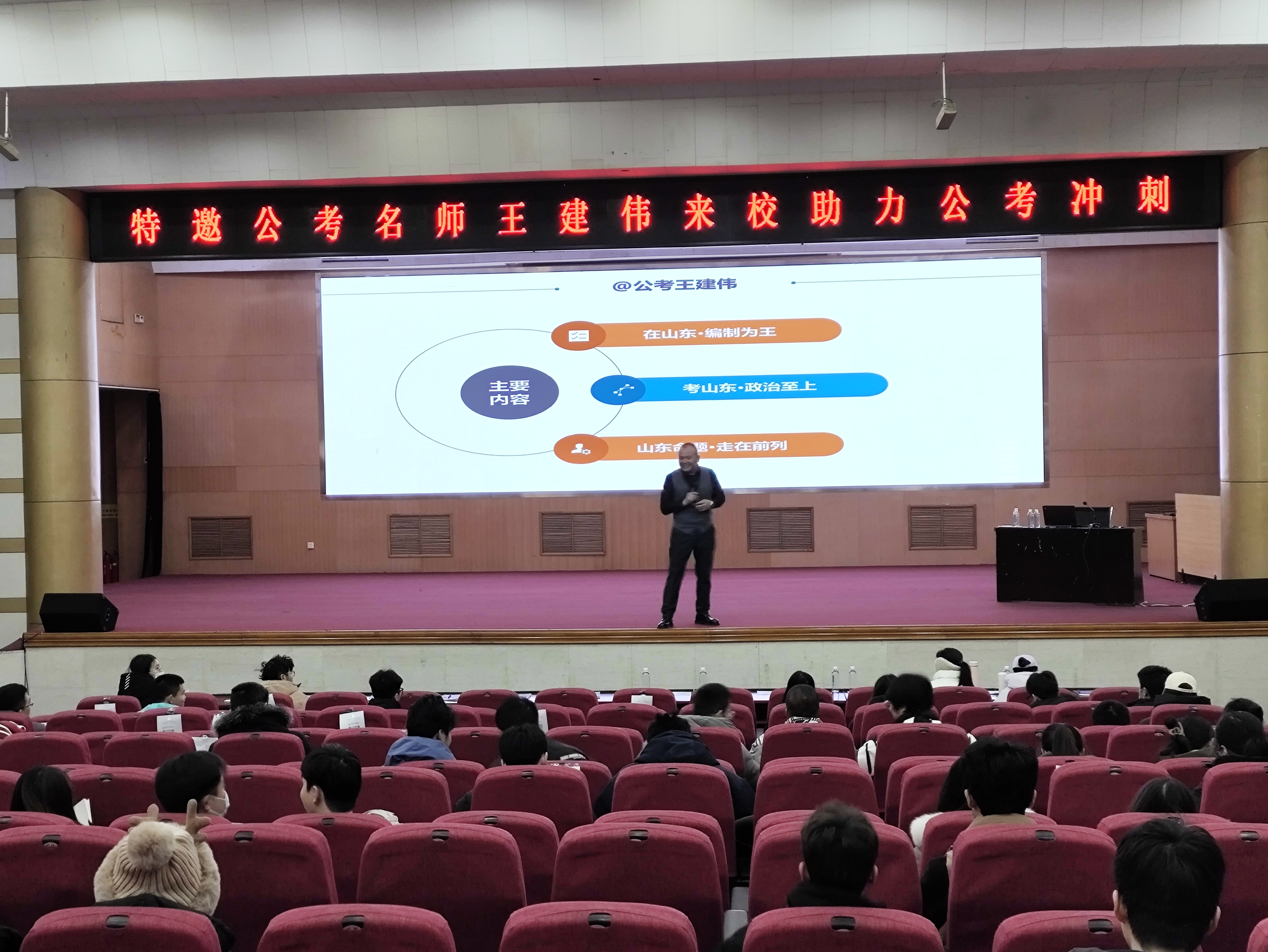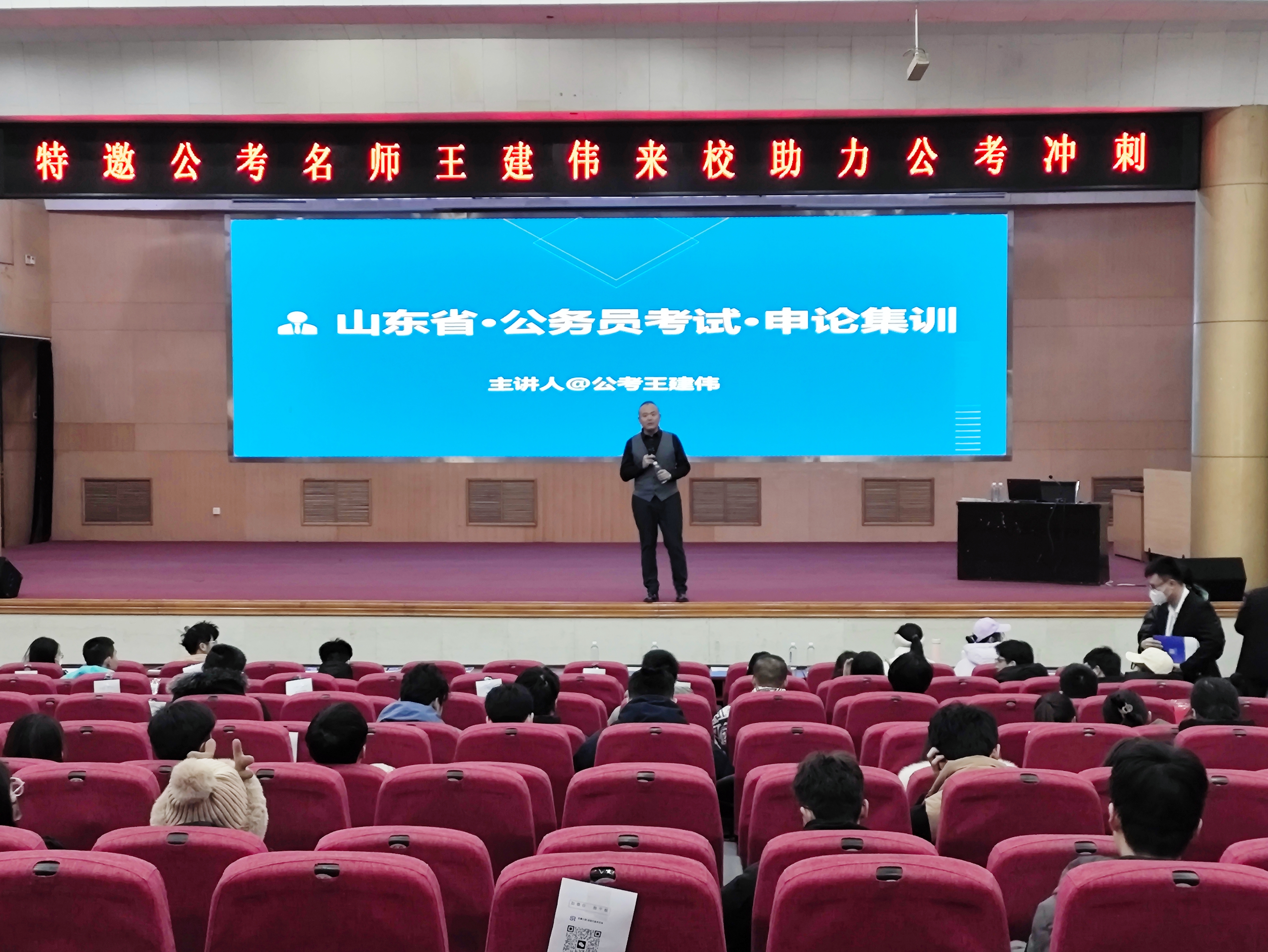 王建伟围绕“在山东·编制为王”、“考山东·政治至上”、“山东命题·走在前列”三个板块对公考展开了详细介绍。首先,他结合当前山东省的公考形势,就编制类型、考试机会、公考科目、考试大纲等方面向同学们展开介绍。随后,重点讲解了申论重要考点和申论作文,传授给同学们申论考场答题技巧。讲座中,王建伟建议备考员工在准备申论时开拓思维,注意知识的积累和题目技巧的把握,掌握申论提分密码。