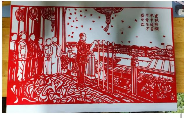 作品简介:剪纸作为一种富有民族特色的传统艺术形式,以其独特的艺术魅力和丰富的文化内涵,在历史长河中流传至今。本作品整体色彩以红色为主,象征着喜庆、祥和,与开国大典这一主题相得益彰。此外,作品中的构图布局也颇具匠心,如天安门城楼、红旗等元素的运用,使得画面显得庄重而神圣,展现了祖国繁荣昌盛的历史时刻。