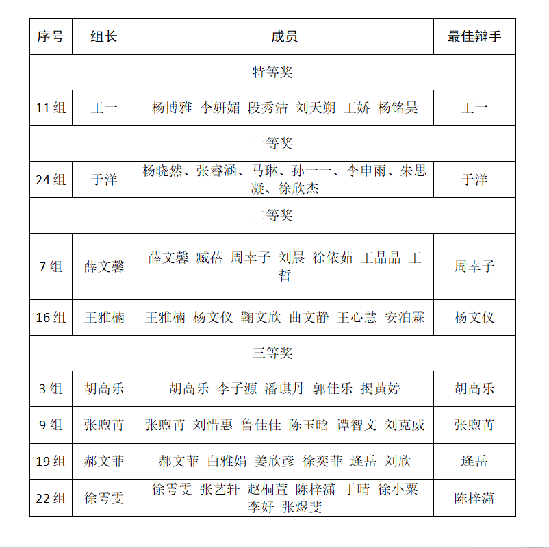 最后,经过评委老师的层层选拔,从八强到四强,从二强到最后冠军的决出。就案件的法律适用、庭审程序、专业术语和案件突破口等方面进行了深入的剖析和精彩的点评。获奖名单如下图所示。