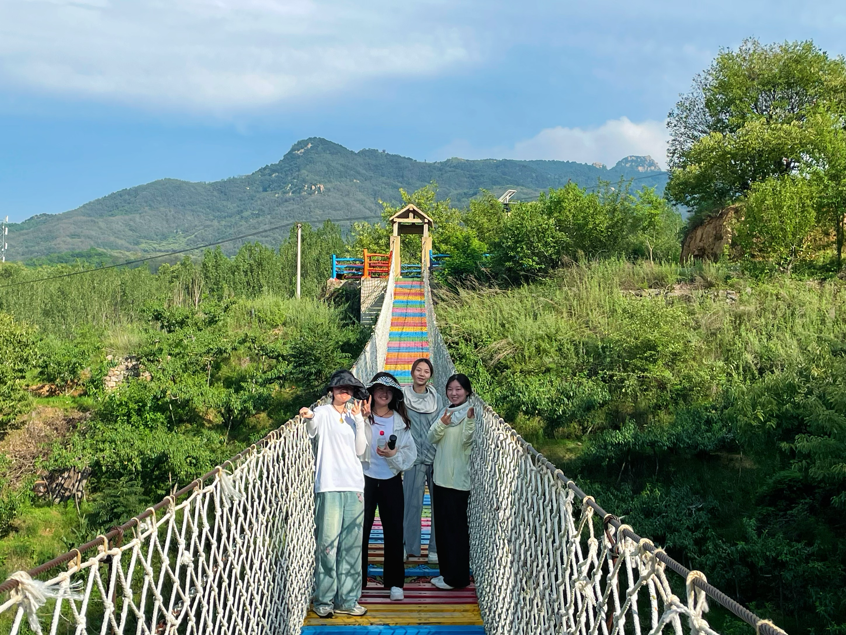 图为实践团成员前往中郝峪村彩虹吊桥访谈游客