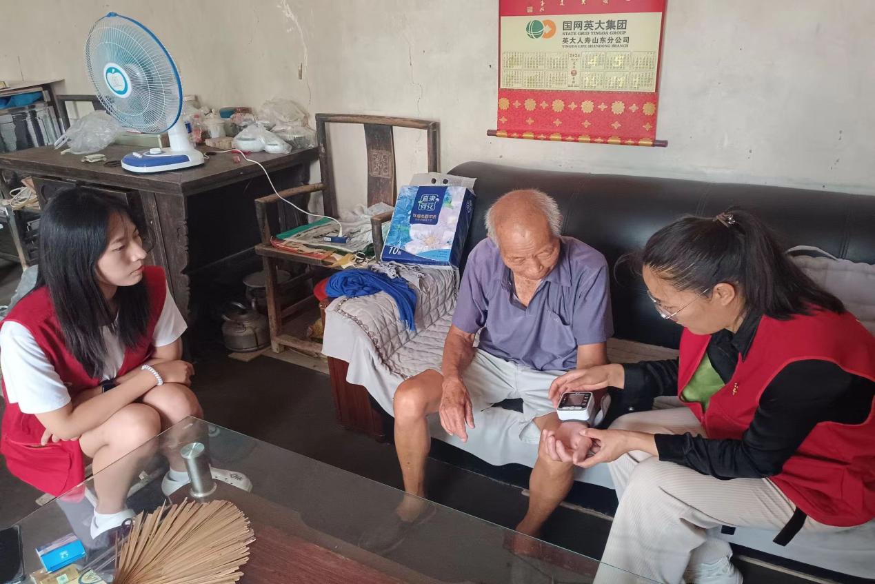 图为负责人亓艳红为老人测量血压