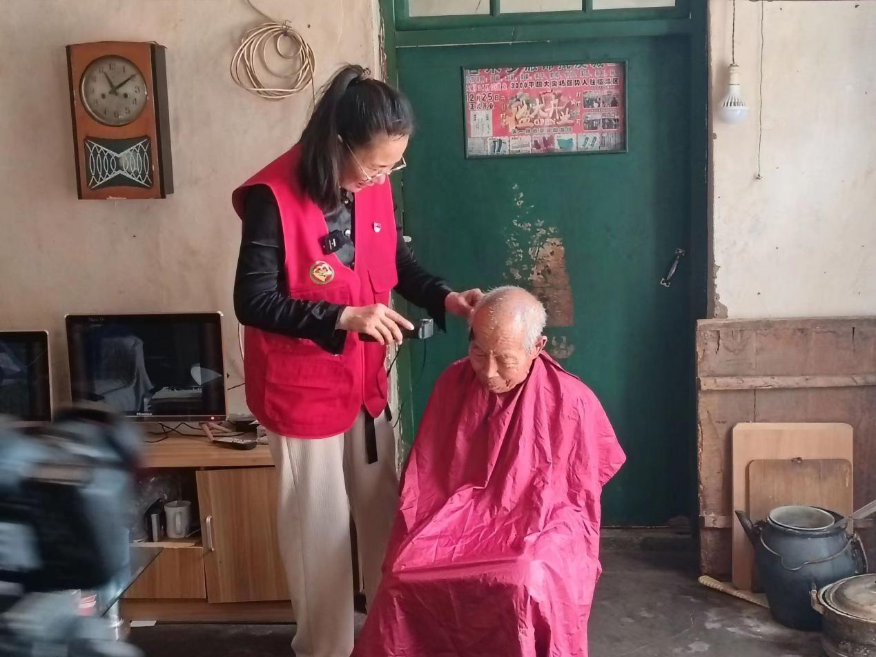 图为负责人亓艳红为老人理发