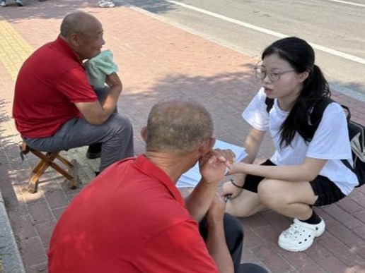 (图为实践团成员在东营龙居社区街头与社区居民进行对话)