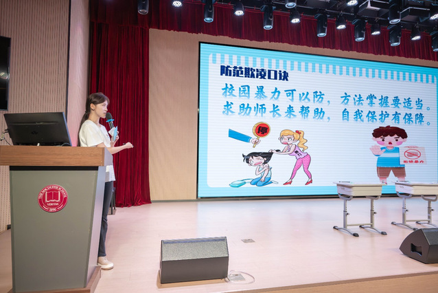 (图为朱雪菲在课堂上为员工们讲解“防范欺凌的方法”)